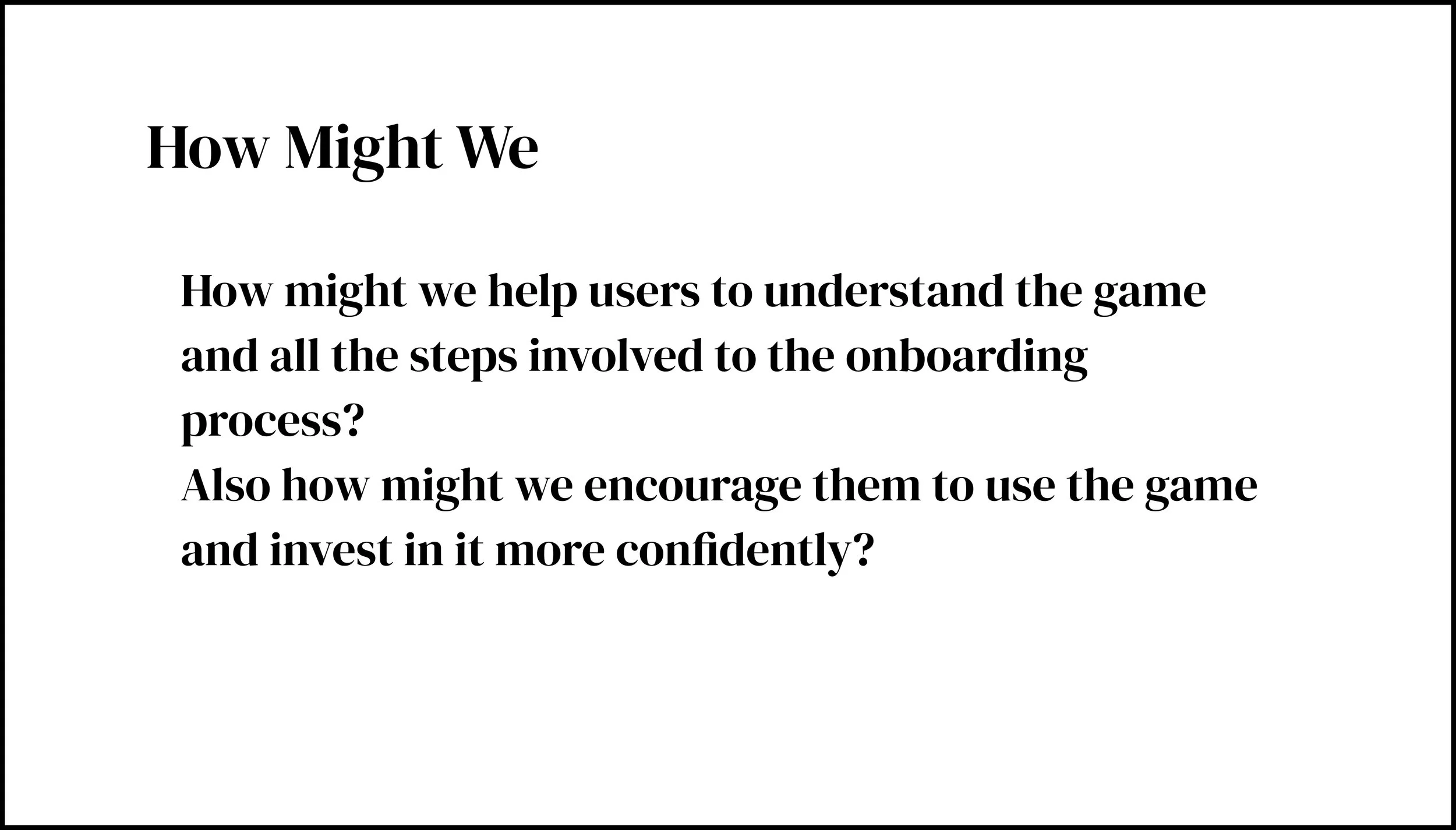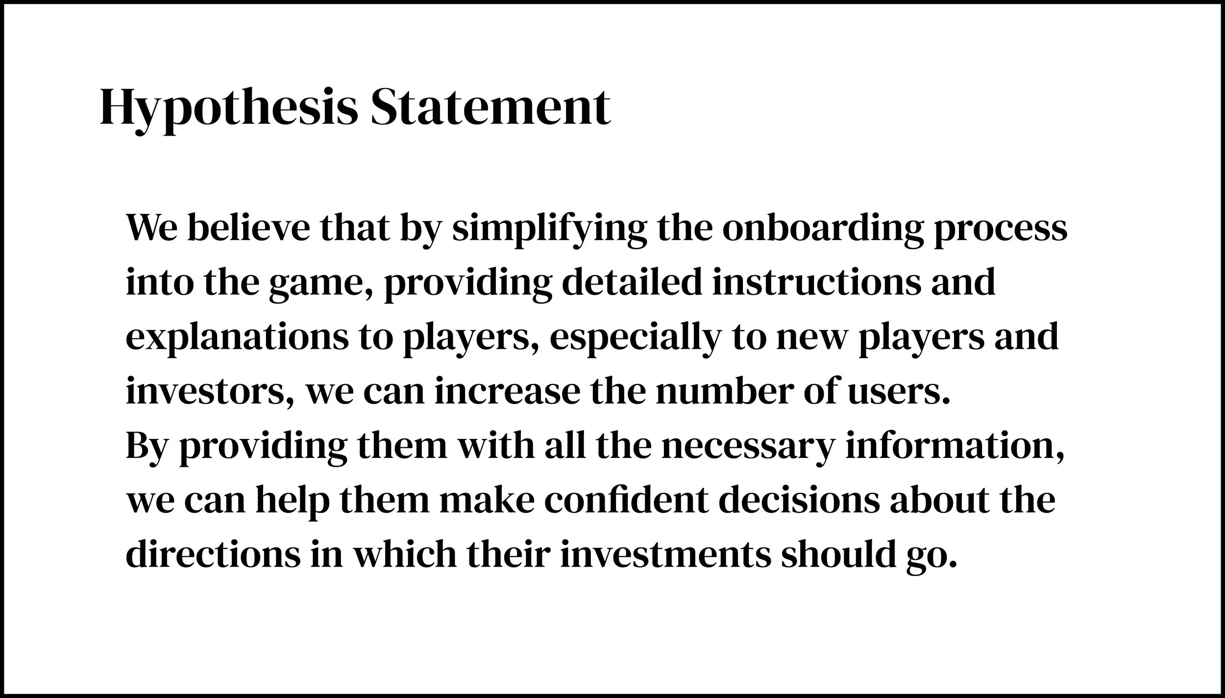 With the analysis that we made, and after collecting all informations that we needed, we formulated a Problem Statement , How Might We and Hypothesis Statement before entering the Ideation phase. Main problem that needs to be solved is clarifying of on boarding process by giving clear navigation to new users, guiding them step by step and in that way to help them to understanding the game better.