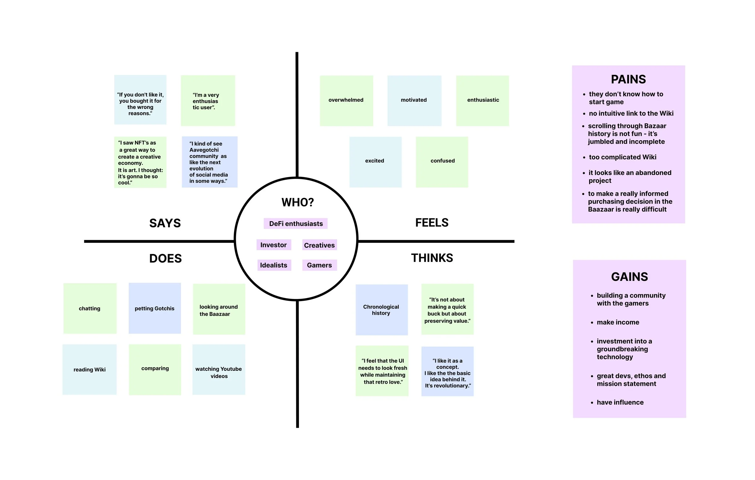 Making the Empathy Map helped us understand core problem of the Aavegotchi users. We divided them in several groups based on their interests, how often they play game, how good they understand game and in general after taking a closer look into the interviews we made with them we got insights of how they feel, what they think, what they say about the game. That gave us main “Gains” and “Pains” of the Aavegotchi users.