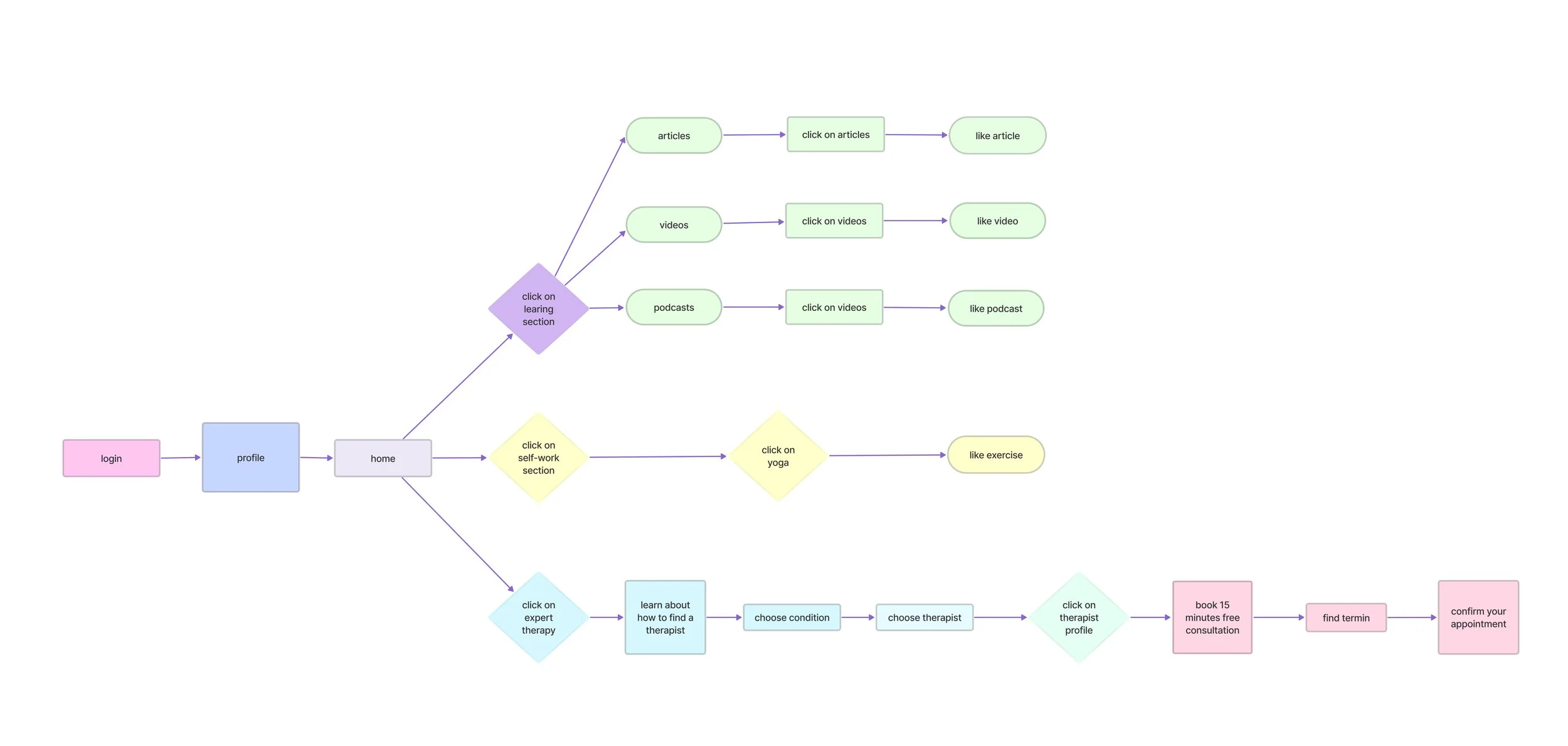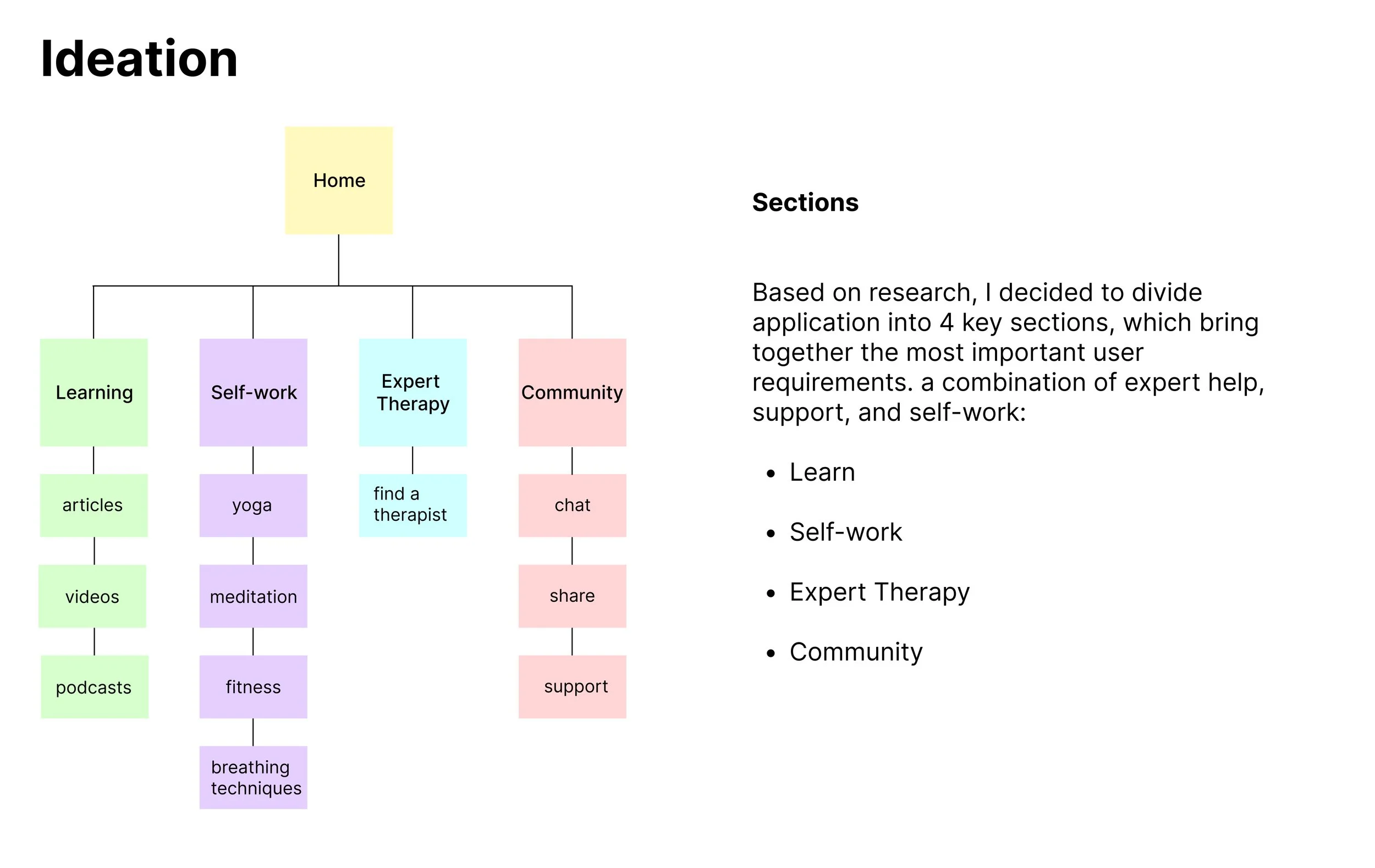 The main goal of the app is helping the user to book an online appointment with a licensed therapist. Other features that are useful in the improvement of mental well-being are community, learning, and self-work. The Hi-Fi prototype was tested with several users.
