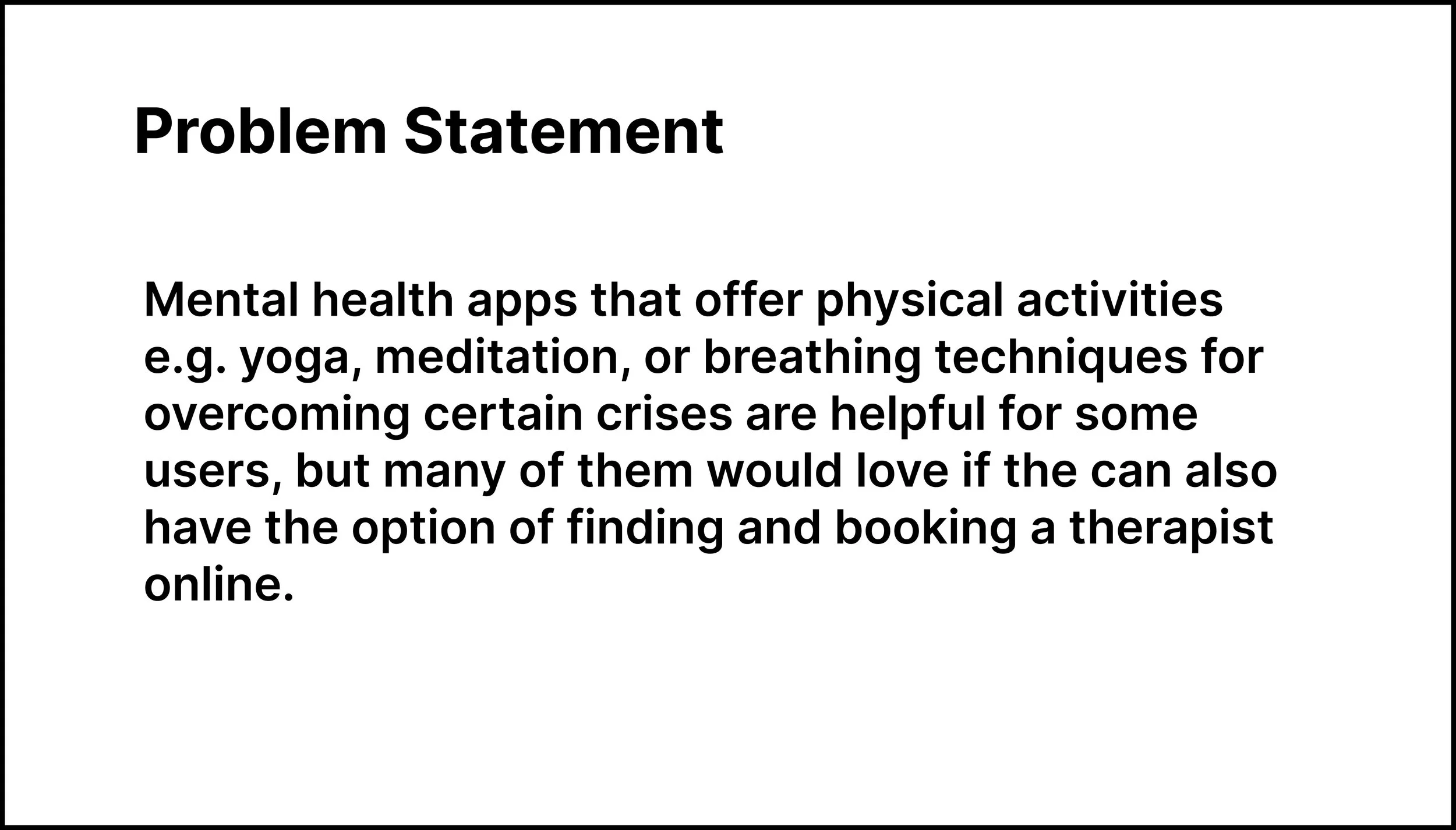 The user research revealed the competitors that we should consider in order to get an understanding of the competitor apps for mental health and online therapy.. The results showed that these apps are either focused on online therapy and communication with the community or focus more on journaling, meditation, learning, and other self-work techniques.